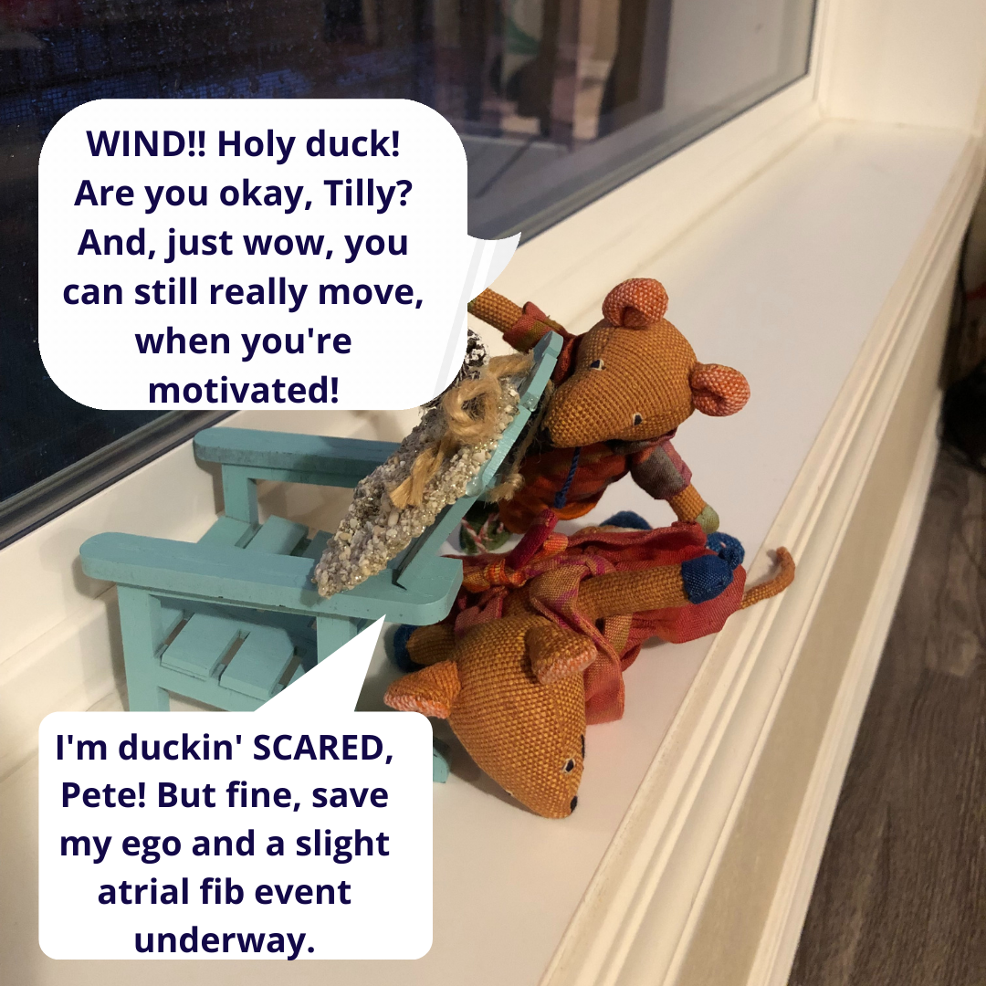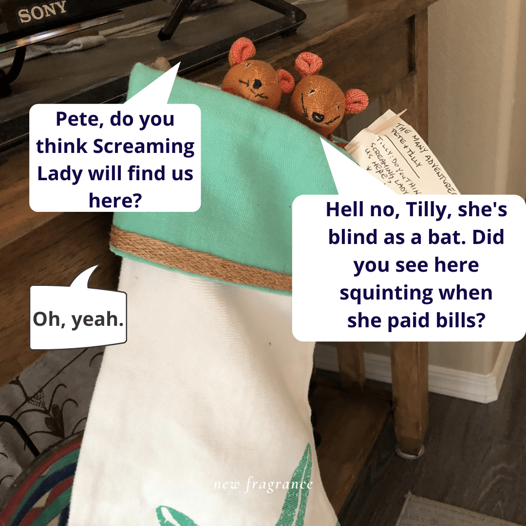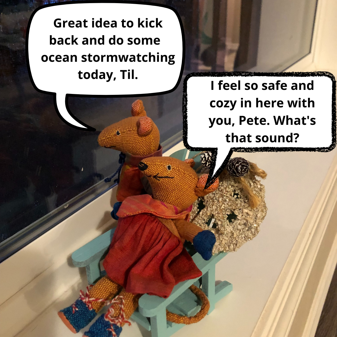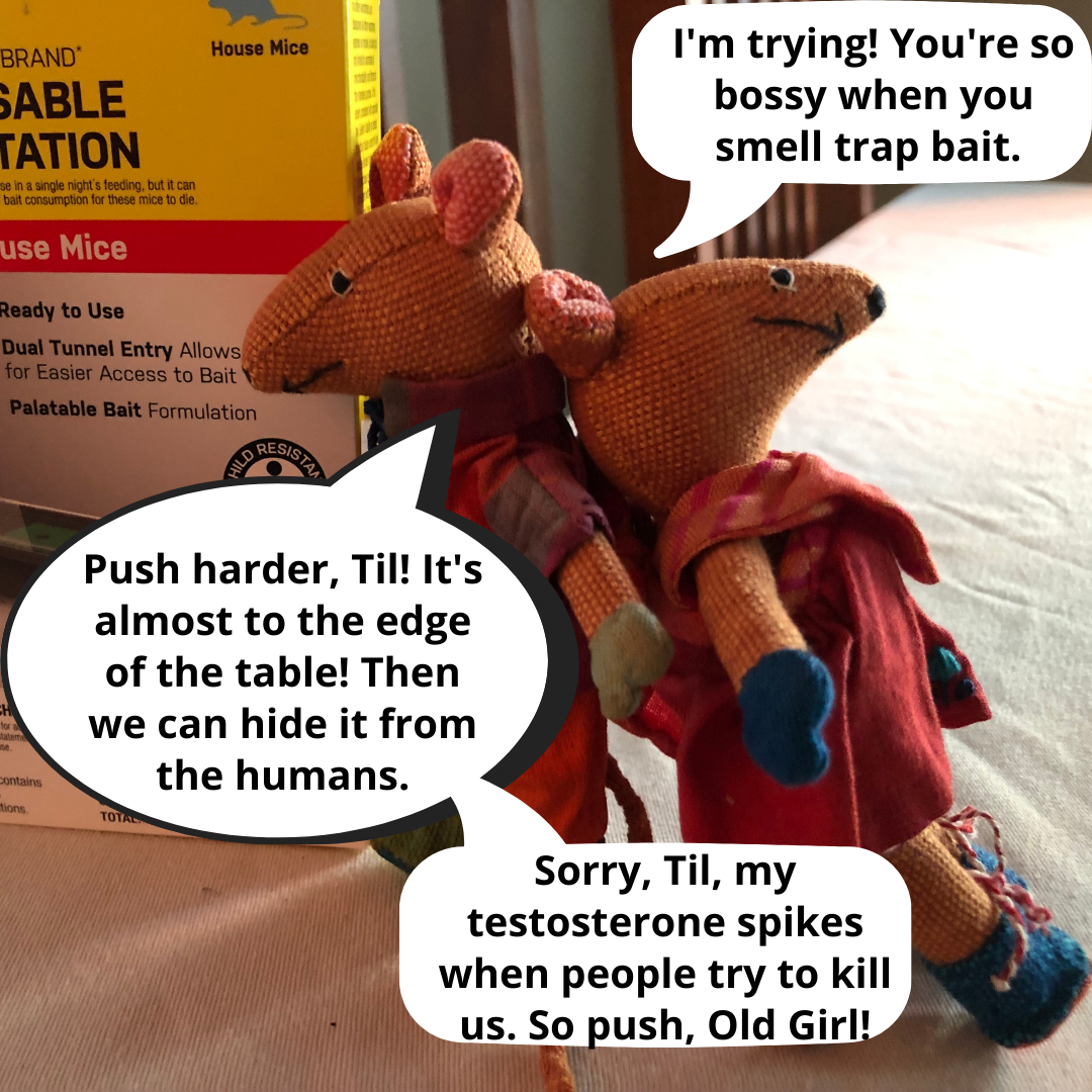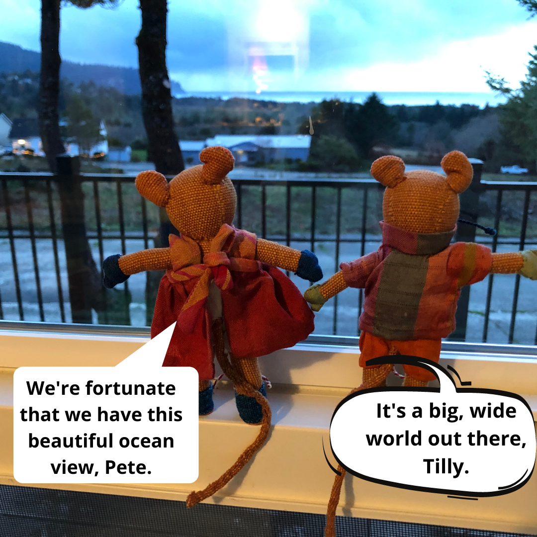 Pete & Tilly are sophisticated (well, sometimes) rural mice who live on the Oregon Coast in the home of their reluctant hosts, Lady Proverbs (aka, Screaming Lady and Crying Lady) and Spinoza’s Nephew (the human, who later joins the angels). These two adventurous mice had lived in the shed, peacefully and undisturbed, until Screaming Lady found them,