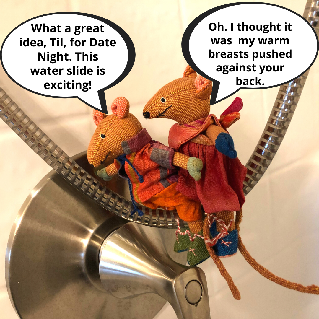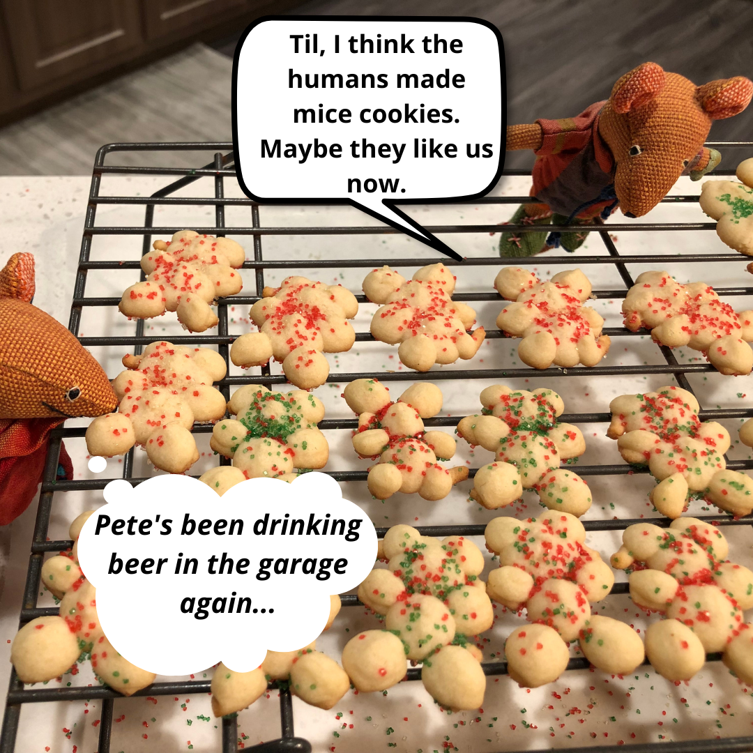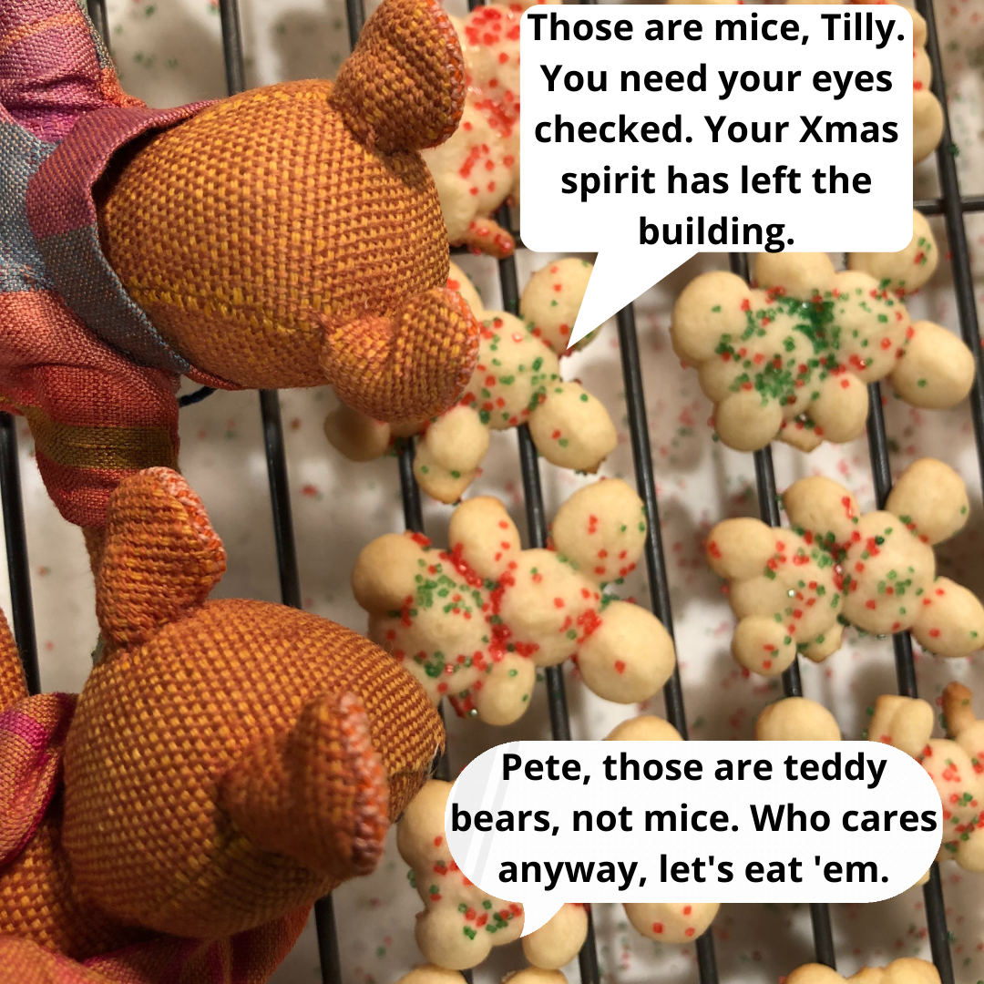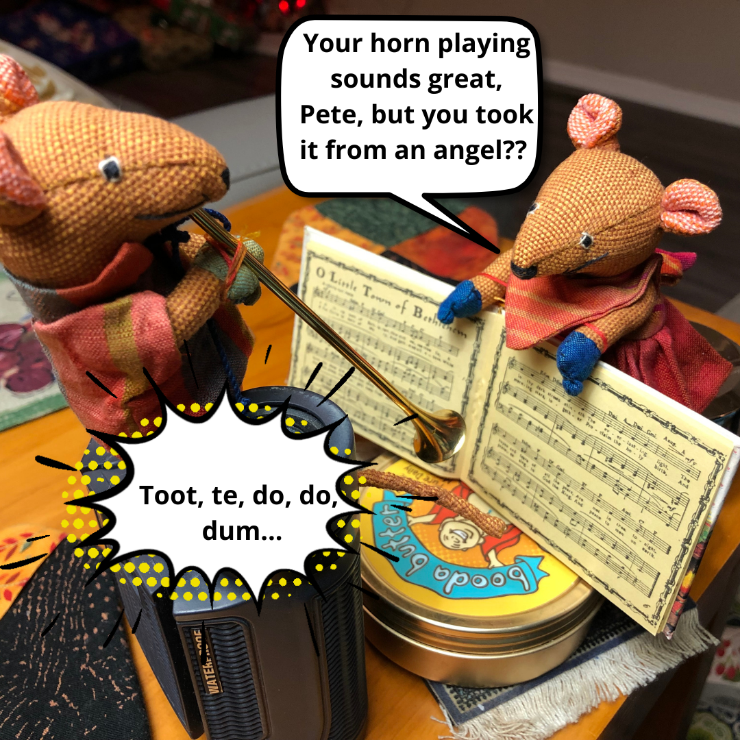 Pete & Tilly are sophisticated (well, sometimes) rural mice who live on the Oregon Coast in the home of their reluctant hosts, Lady Proverbs (aka, Screaming Lady and Crying Lady) and Spinoza’s Nephew (the human, who later joins the angels). These two adventurous mice had lived in the shed, peacefully and undisturbed, until Screaming Lady found them,