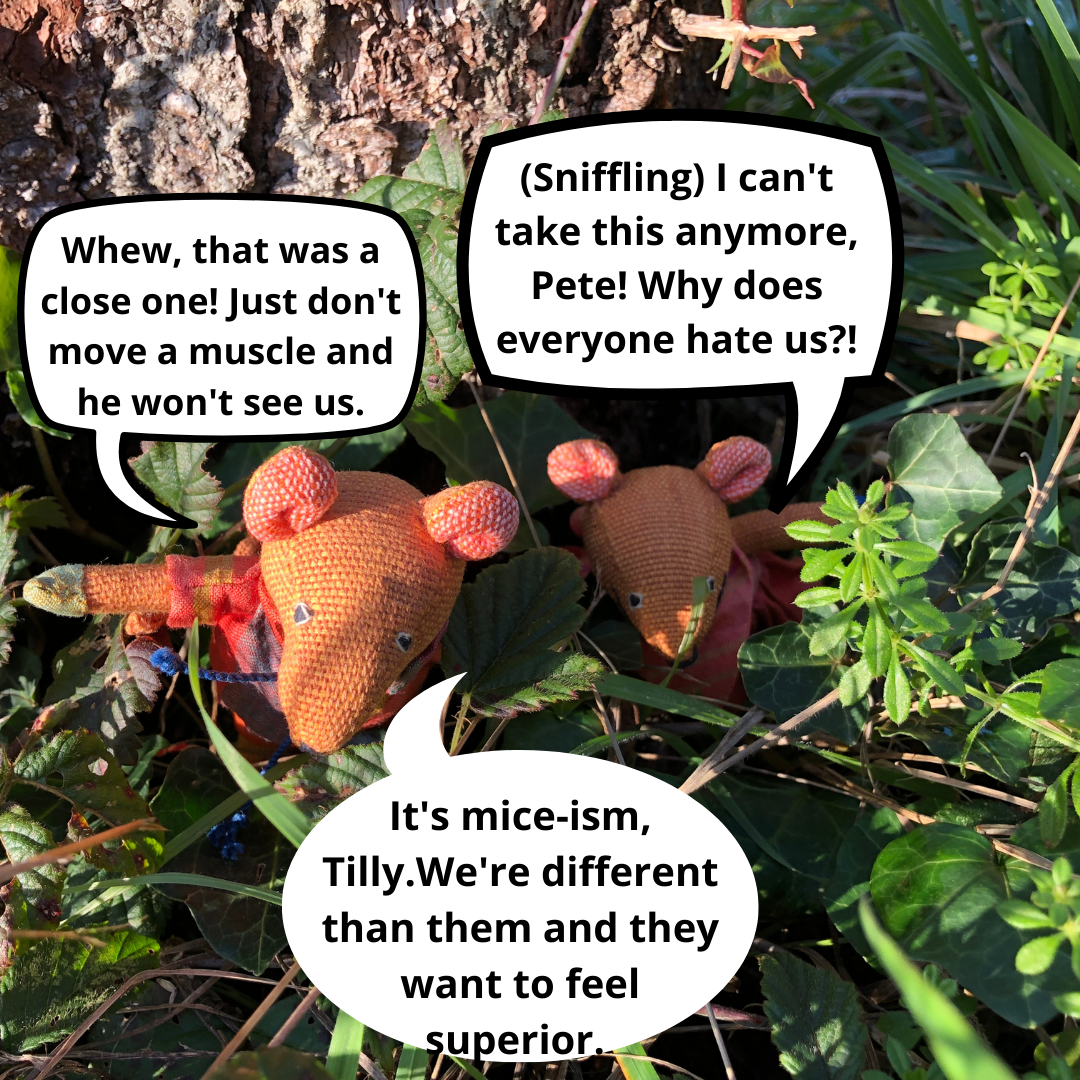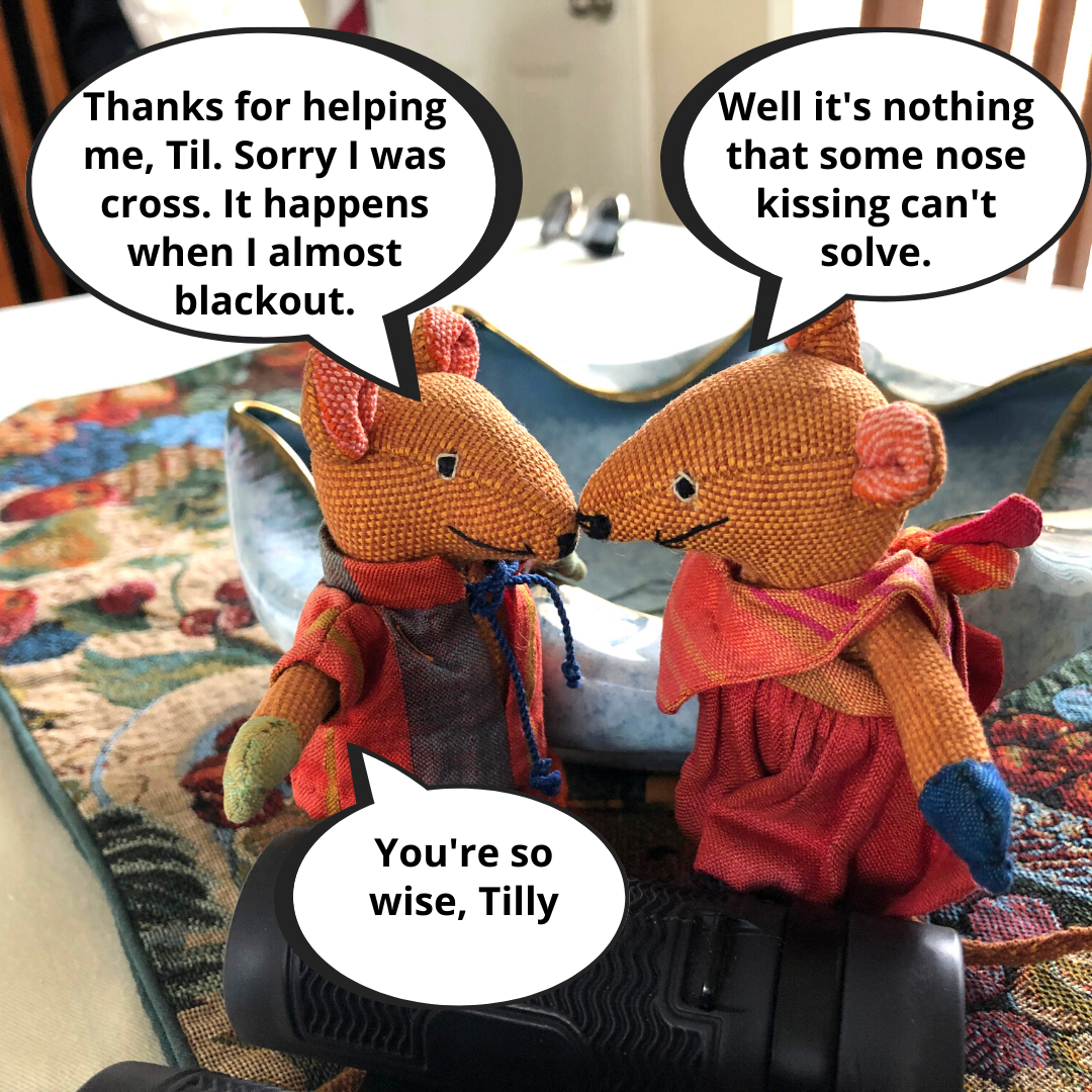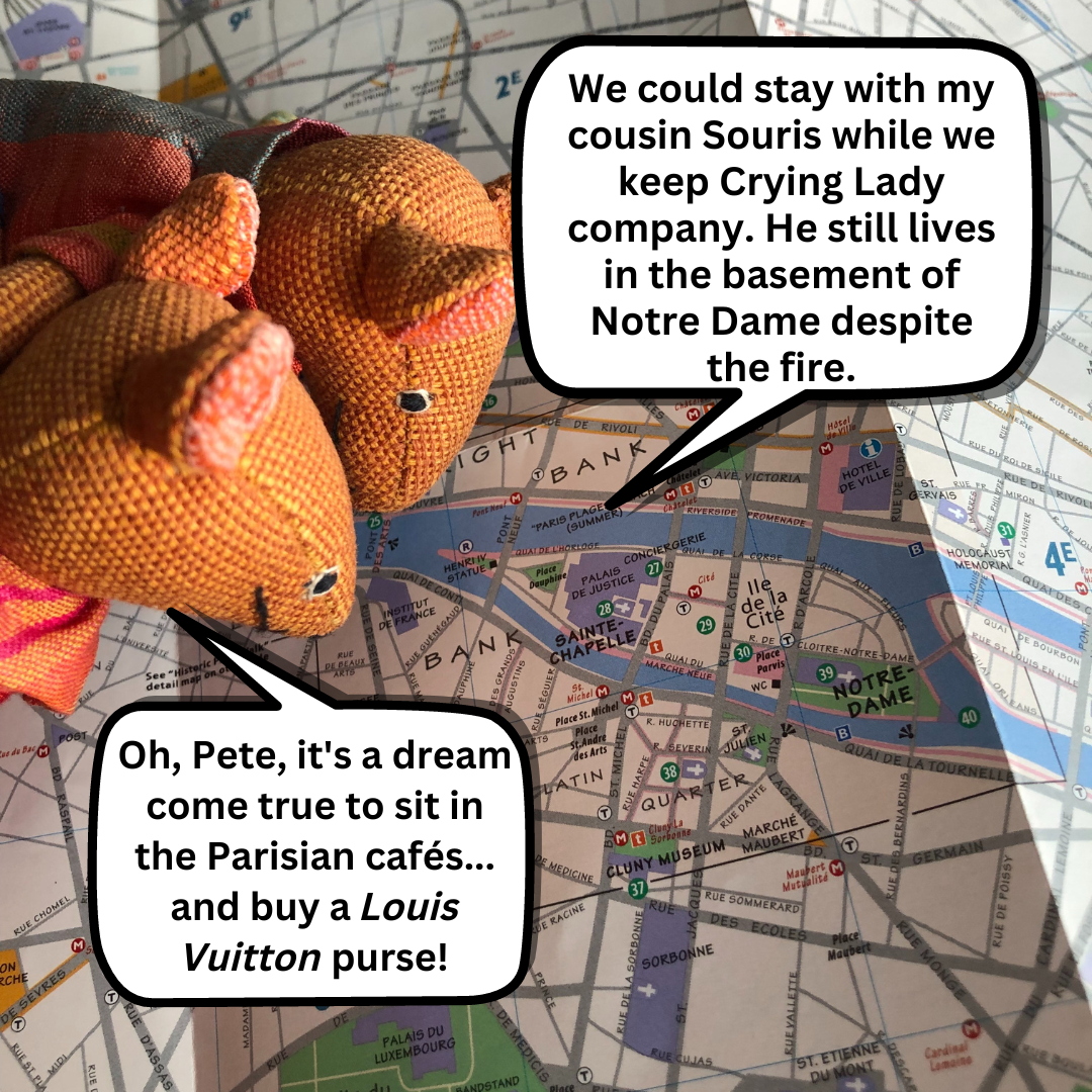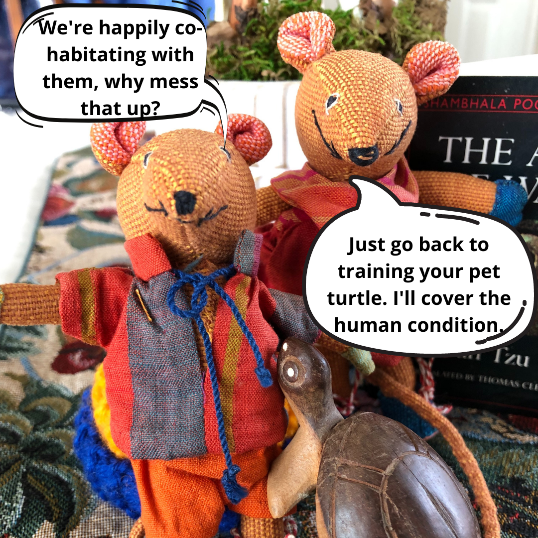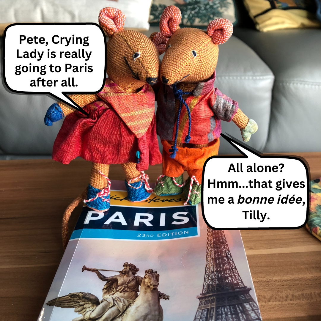 Pete & Tilly are sophisticated (well, sometimes) rural mice who live on the Oregon Coast in the home of their reluctant hosts, Lady Proverbs (aka, Screaming Lady and Crying Lady) and Spinoza’s Nephew (the human, who later joins the angels). These two adventurous mice had lived in the shed, peacefully and undisturbed, until Screaming Lady found them,