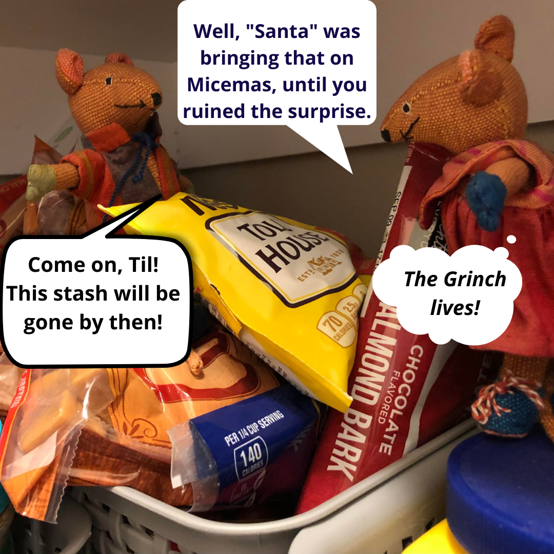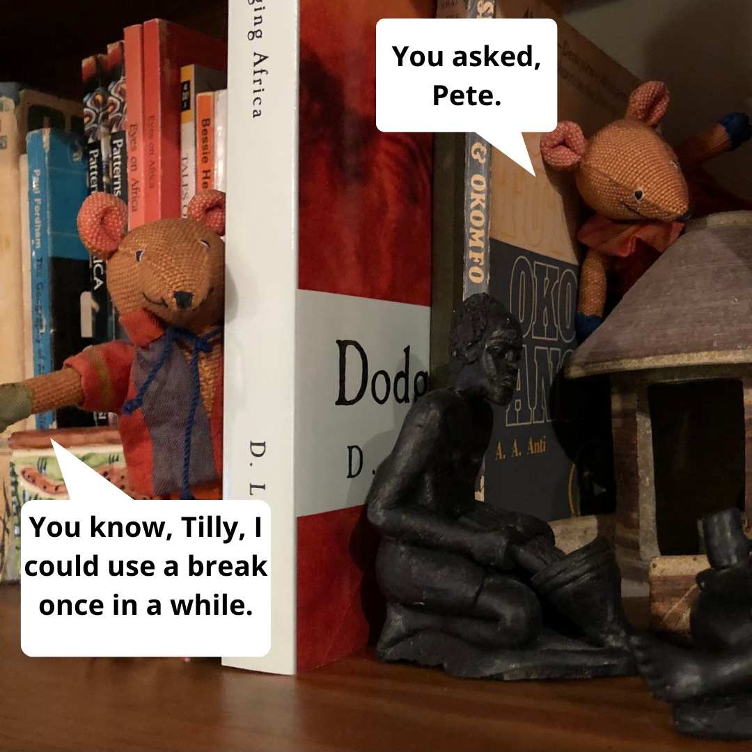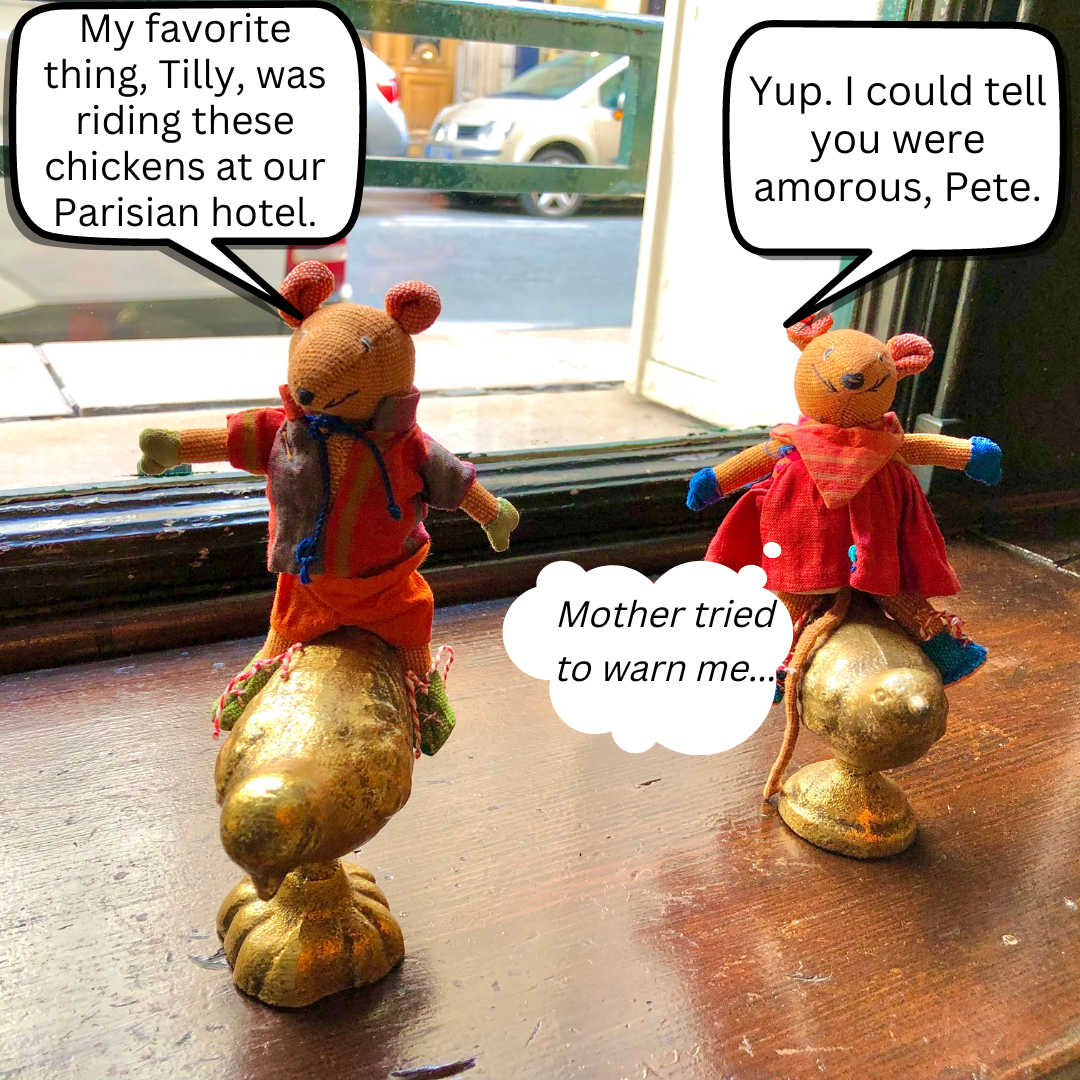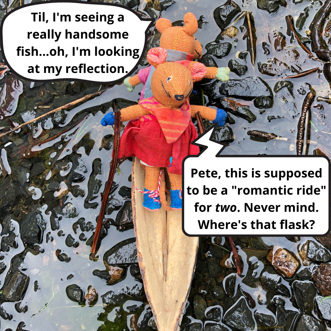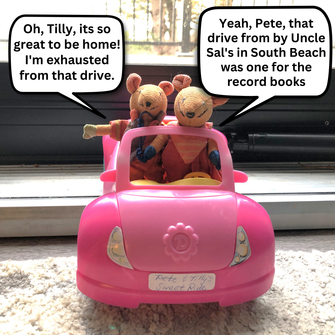 screamed, dropped their “home”, a box of dishes in which their toilet paper nest was hidden, and then they were dumped in a forest across the street. An unceremonious dumping, mind you, which has yet to be forgiven. That was when Pete & Tilly decided to move into the Big House, do their best to stay undetected, and continue their madcap adventures in the warmth and comfort of a brand new home; and occassionally travel with Screaming Lady.
