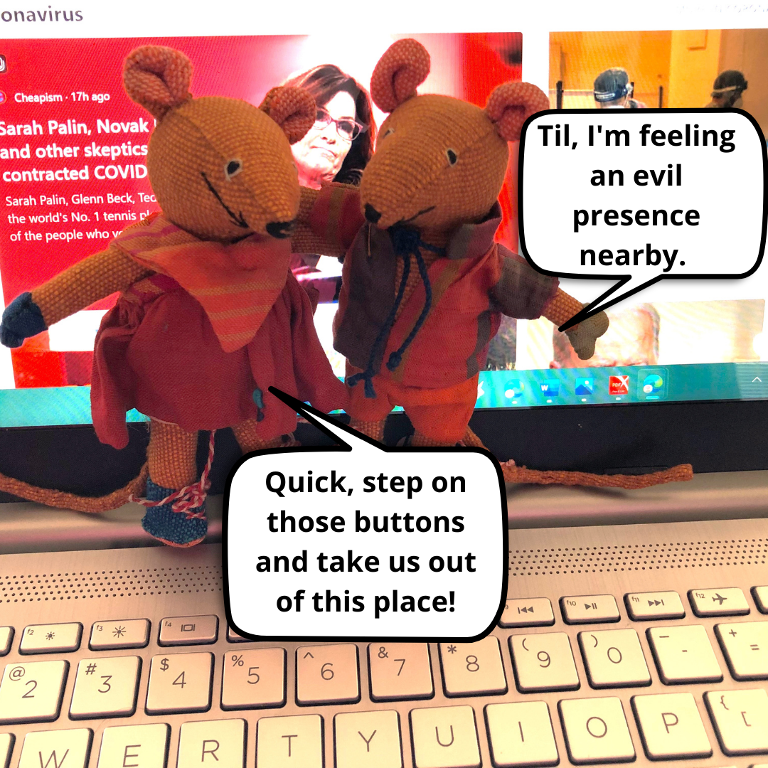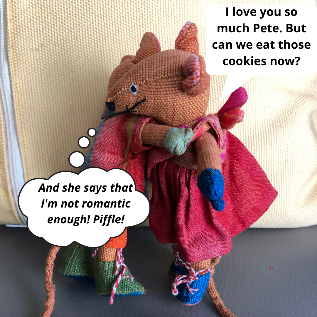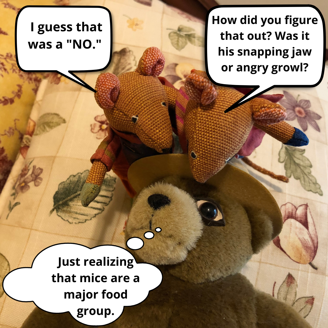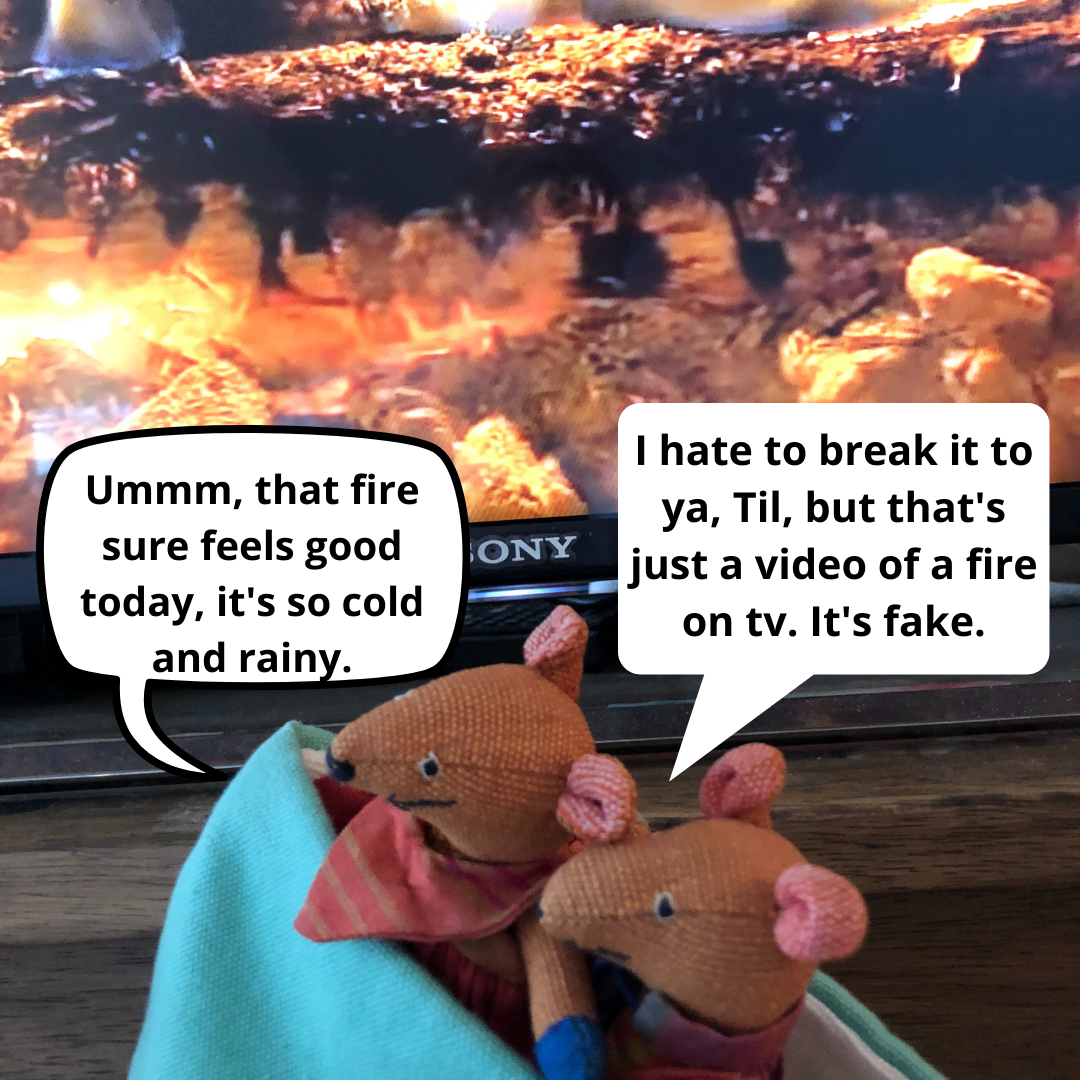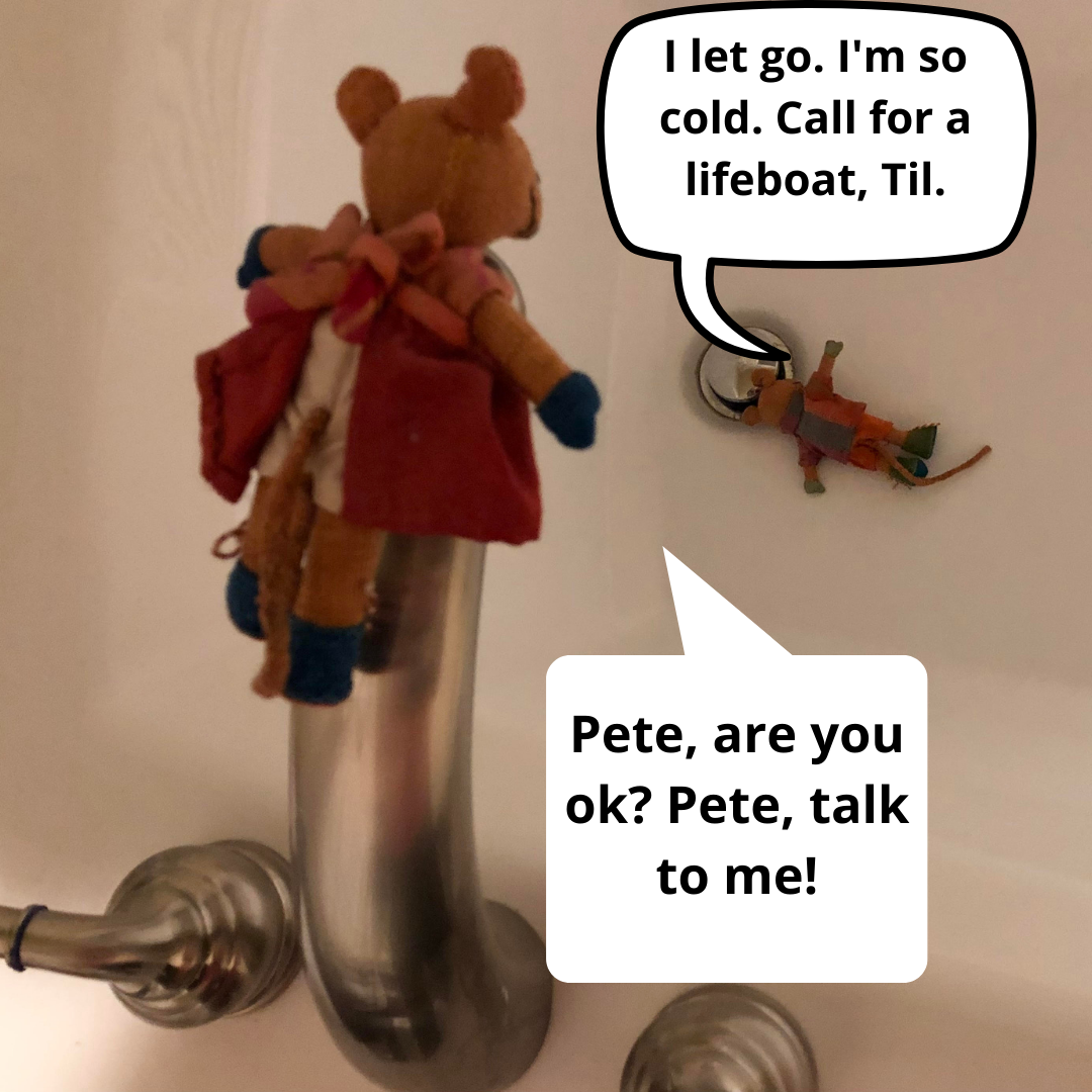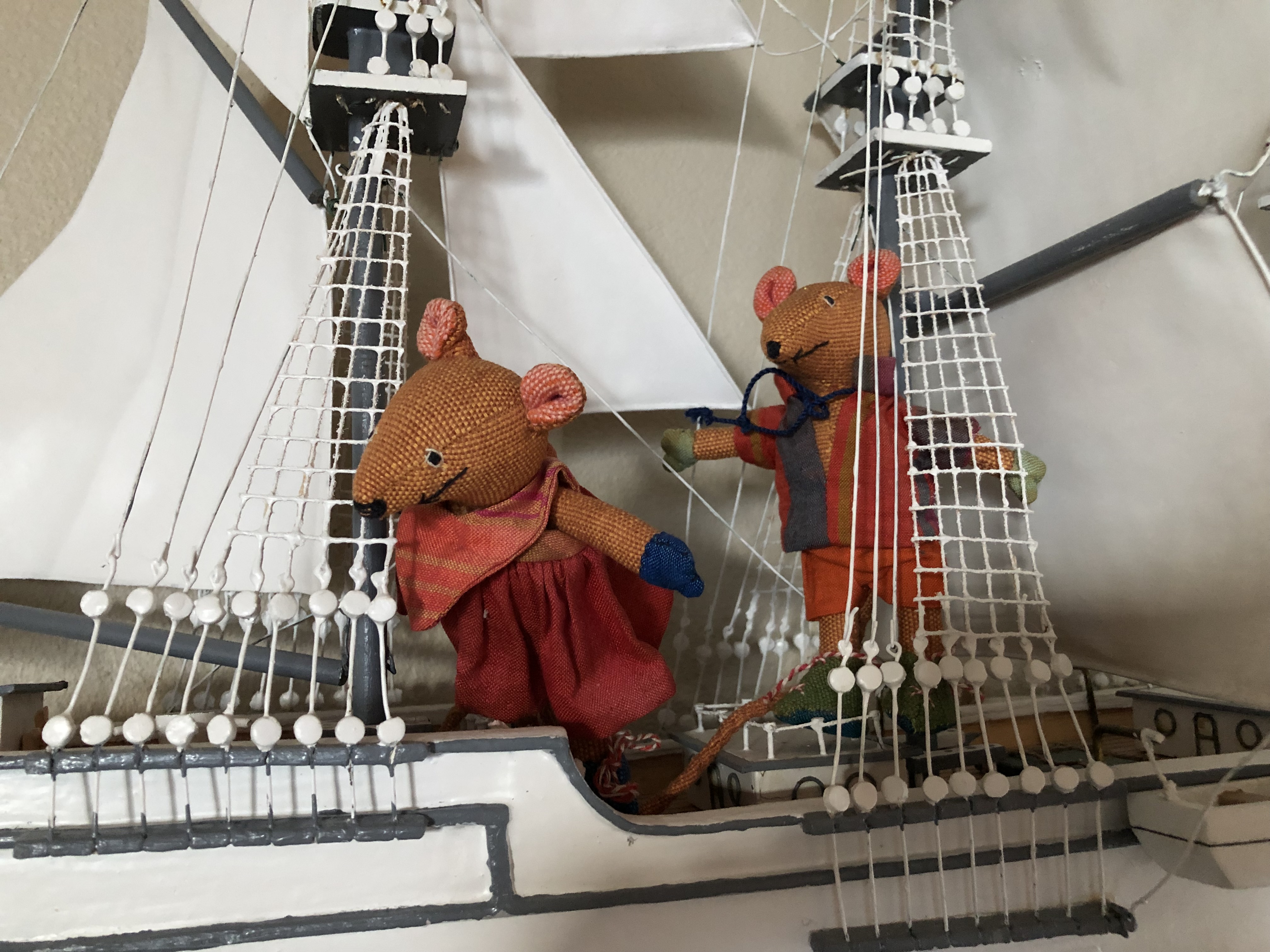 screamed, dropped their “home”, a box of dishes in which their toilet paper nest was hidden, and then they were dumped in a forest across the street. An unceremonious dumping, mind you, which has yet to be forgiven. That was when Pete & Tilly decided to move into the Big House, do their best to stay undetected, and continue their madcap adventures in the warmth and comfort of a brand new home; and occassionally travel with Screaming Lady.